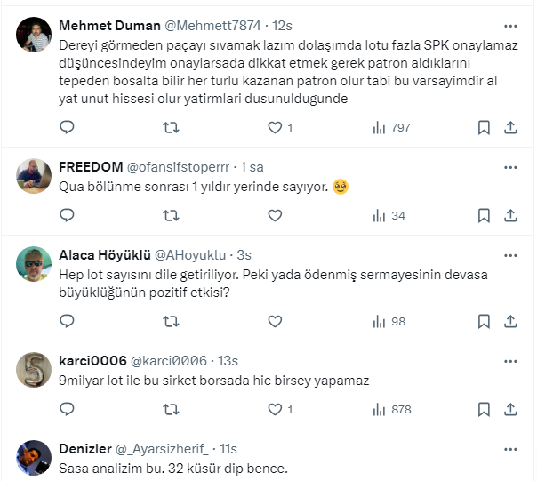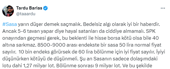 Sasa yarın düşer demek saçmalık. Bedelsiz algı olarak iyi bir haberdir. Ancak 5-6 tavan yapar diye hayal satanları da ciddiye almamalı. SPK onayından geçmesi gerek, bu beklenti ile hisse borsa kötü olsa bile 40 altına sarkmaz. 8500-9000 arası endekste bir Sasa 50 lira normal fiyat sayılır. 10 bin endeks görürsek de 60 lira bölünme için iyi fiyat sayılır. İyiyi düşünürken kötüyü de düşünmeli. Şu an Sasa’nın sadece dolaşımdaki lotu dahi 1,27 milyar lot. Bölünme sonrası 9 milyar lot. Ve bu şekilde dolaşım itibariyle eğer yanlışım yoksa borsanın en fazla lotu olan hissesi olacak. Şu an İş Bankası 8,2 milyar ile lider. Yani bölünene kadar, fırsatlarla güzel olsa da bölündükten sonra ızdıraba dönüşebilir. Bölünme onayı geldiği gün beklentisi biter.