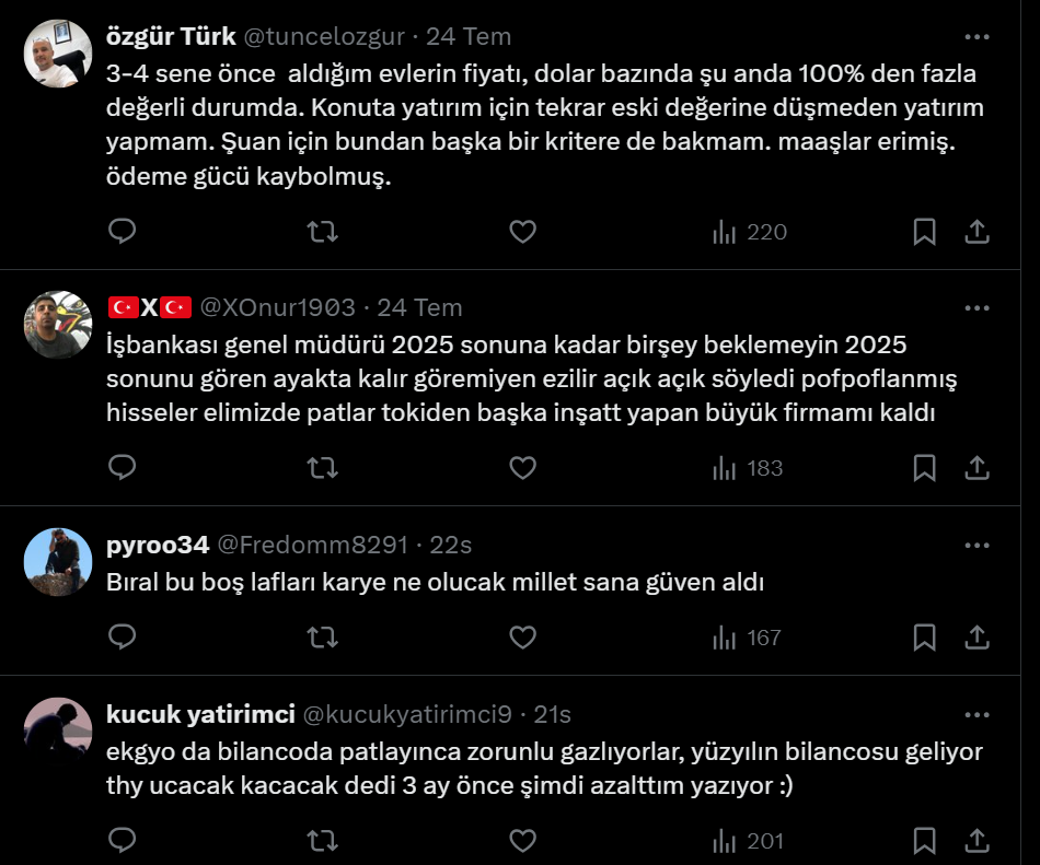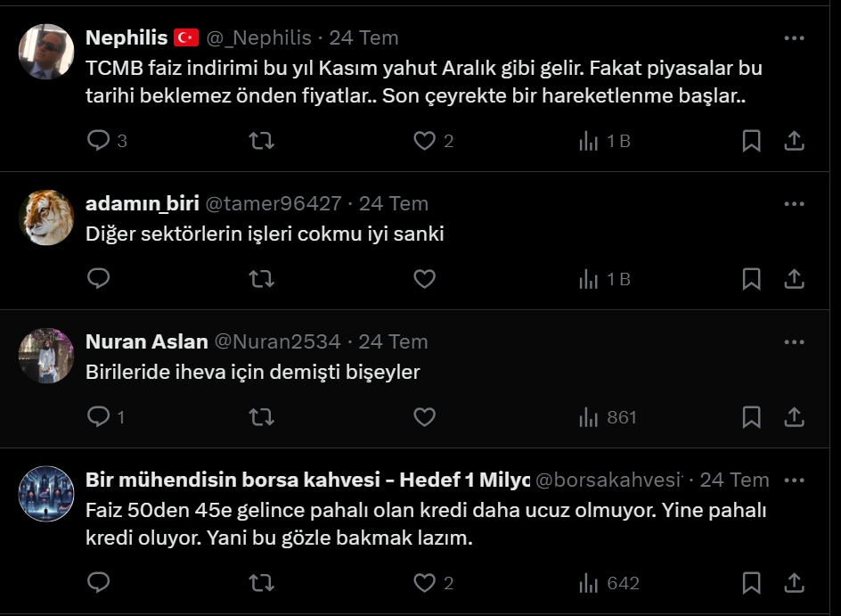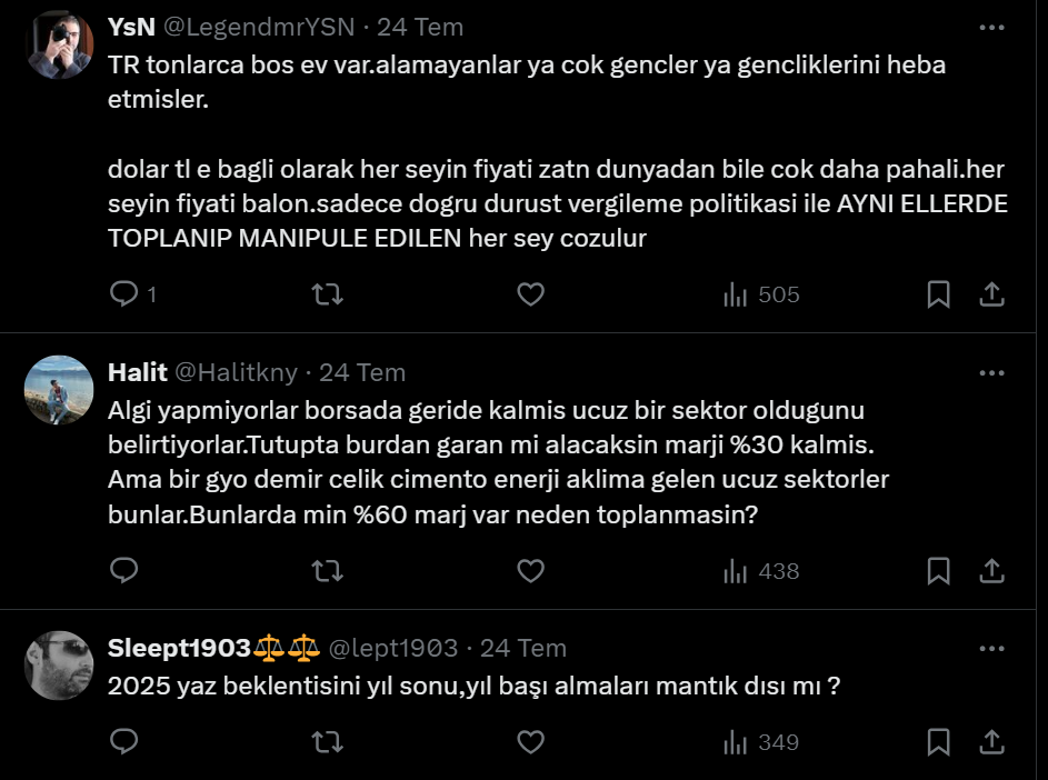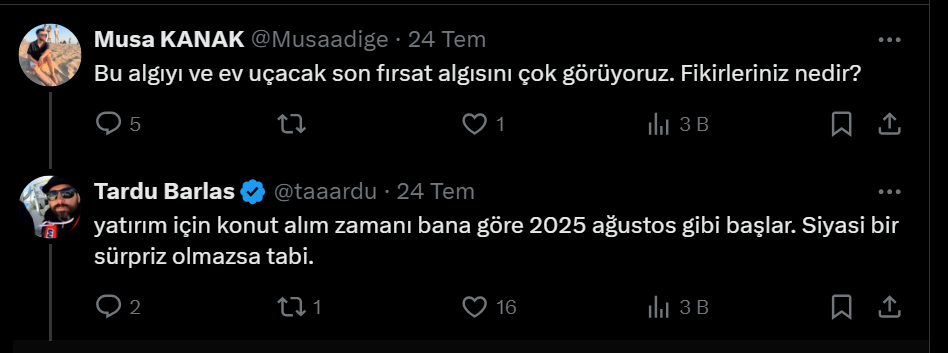Barlas paylaşımında, “Koca koca analistler, faiz düşecek algısı ile GYO’lar uçacak algısı yapıyor. Bunun konut fiyatları uçacak demekten farkı yok.