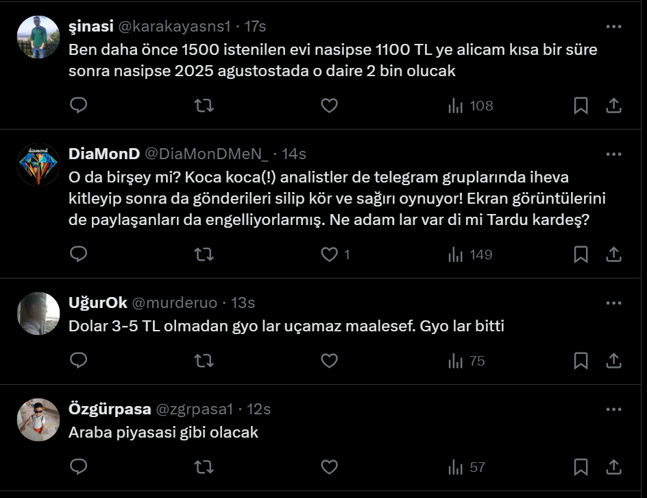 Vatandaş ev sahibi olmak için piyasada taşların yerine oturmasını beklerken, Borsa Temel Analisti Tardu Barlas’tan ilginç bir açıklama geldi. Barlas, https://x.com/taaardu X sosyal medya hesabından yaptığı paylaşımda GYO’lar üzerinden konut fiyatlarında da yükselecek algısı yapıldığını söyledi.