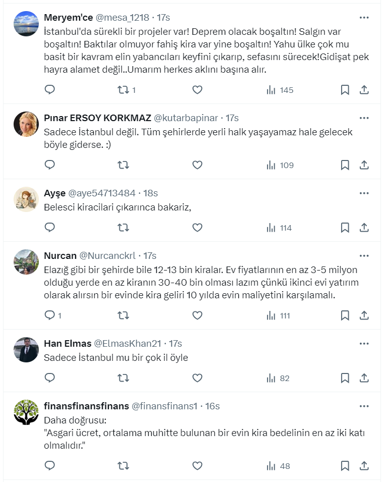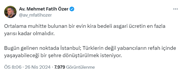 Paylaşımında ortalama muhitte bulunan bir evin kira bedeli asgari ücretin en fazla yarısı kadar olması gerektiğini dile getiren Mehmet Fatih Özer "Bugün gelinen noktada İstanbul; Türklerin değil yabancıların refah içinde yaşayabileceği bir şehre dönüştürülmek isteniyor." ifadelerini kullandı.