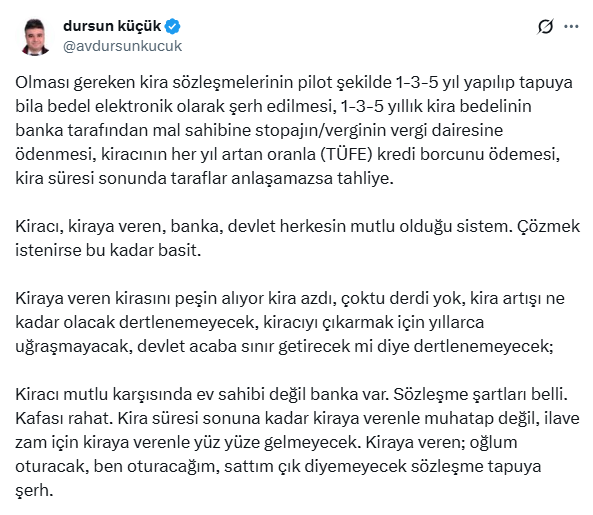 'kira sözleşmelerinin pilot şekilde 1-3-5 yıl yapılıp tapuya bila bedel elektronik olarak şerh edilmesi, 1-3-5 yıllık kira bedelinin banka tarafından mal sahibine stopajın,verginin vergi dairesine ödenmesi, kiracının her yıl artan oranla (TÜFE) kredi borcunu ödemesi, kira süresi sonunda taraflar anlaşamazsa tahliye edilmeli' diyen ünlü avukat, bu sistemle kiracı, kiraya veren, banka, devlet herkesin mutlu olacağını açıkladı.