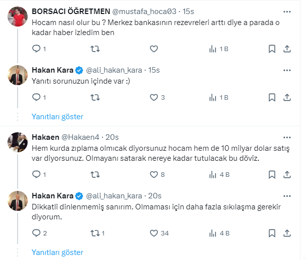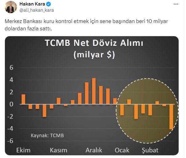 İktisatçı akademisyen, Bilkent Üniversitesi Öğretim Üyesi, TCMB eski başekonomisti Prof. Dr. Ali Hakan Kara, https://twitter.com/ali_hakan_kara resmi X sosyal medya hesabından, “Merkez Bankası kuru kontrol etmek için sene başından beri 10 milyar dolardan fazla sattı” derken bunun nedenlerini de şöyle açıkladı: