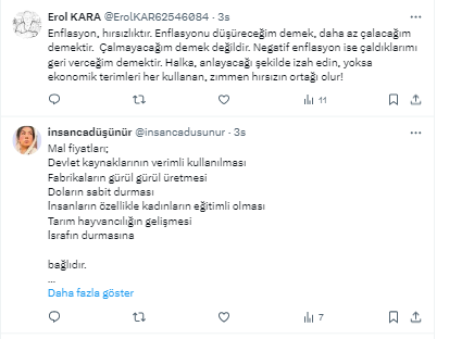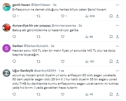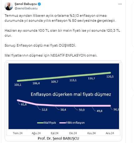 Ziraat Bankası eski Genel Müdür Yardımcısı ve Başkent Üniversitesi Uluslararası Finans ve Bankacılık Bölüm Başkanı Prof. Dr. Şenol Babuşcu, https://x.com/senolbabuscu X sosyal medya hesabından yaptığı paylaşımda, Temmuz ayından itibaren aylık ortalama yüzde 3,13 enflasyon olması durumunda yıl sonunda yıllık enflasyonun yüzde 50 seviyesinde gerçekleşeceğini belirtti. Haziran ayı sonunda 100 lira olan bir malın fiyatının ise yıl sonunda 120,3 Türk Lirası olacağını kaydetti. “Sonuç olarak enlasyon düştü mal fiyatı düşmedi” diyen Babuşcu, mal fiyatlarının düşmesi için negatif enflasyon olması gerektiğini söyledi.