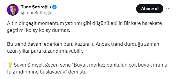Altın piyasasındaki hareketlilik devam ederken ünlü ekonomist Tunç Şatıroğlu twitter.com/TuncSatiroglu X sosyal medya hesabından yaptığı paylaşımda altınla ilgili bir değerlendirmede bulunarak, neden altın alınması gerektiğini anlattı. Tunç Şatıroğlu paylaşımında şunları anlattı:
