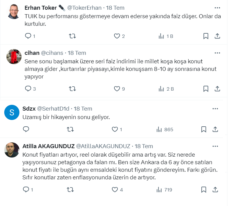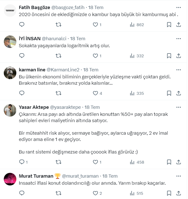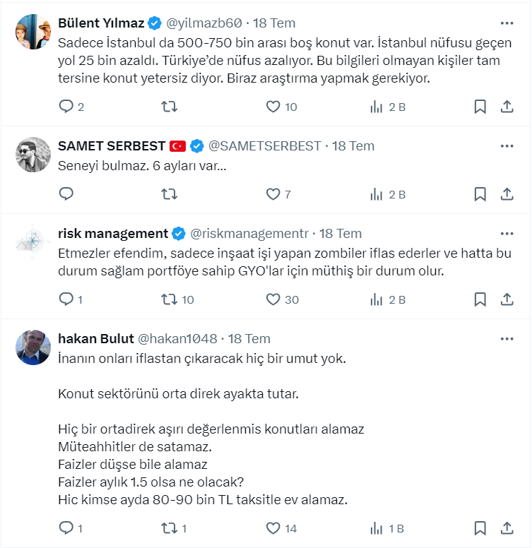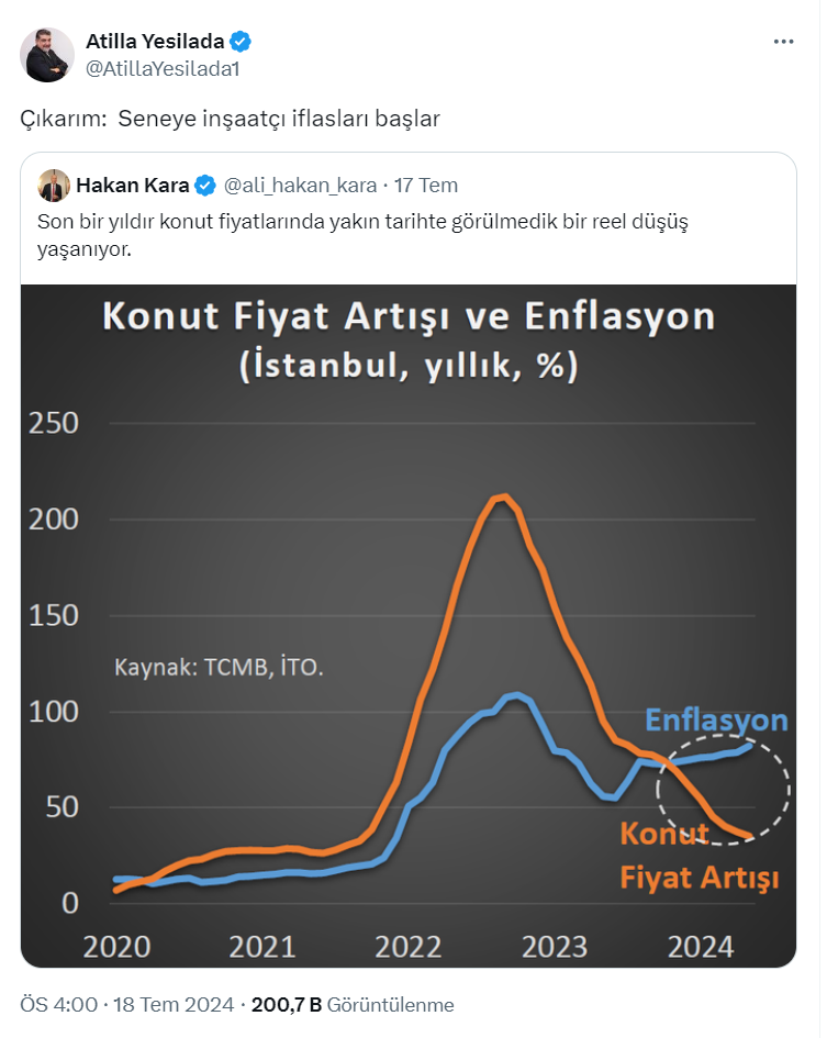 Söz konusu paylaşımı resmi X hesabı https://x.com/AtillaYesilada1 üzerinden alıntılayan ünlü Ekonomist Atilla Yeşilada "Çıkarım: Seneye inşaatçı iflasları başlar" ifadelerini kullandı.