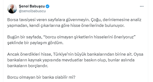 Prof. Dr. Şenol Babuşcu, Şenol Babuşcu, https://x.com/senolbabuscu X sosyal medya hesabı üzerinden yaptığı paylaşımda, borsa tavsiyesi veren sayfaların kendi çıkarlarına göre hisse önerdiğini ifade etti. Borcu olmayan şirket önerilerinin ise doğruyu yansıtmadığını söyledi.