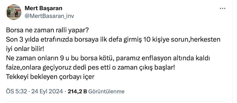 Mert Başaran resmi X hesabı https://x.com/MertBasaran_inv üzerinden yaptığı paylaşımda borsanın ne zaman ralli yapacağını açıkladı.