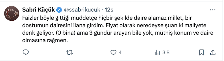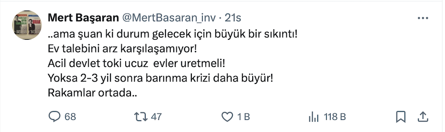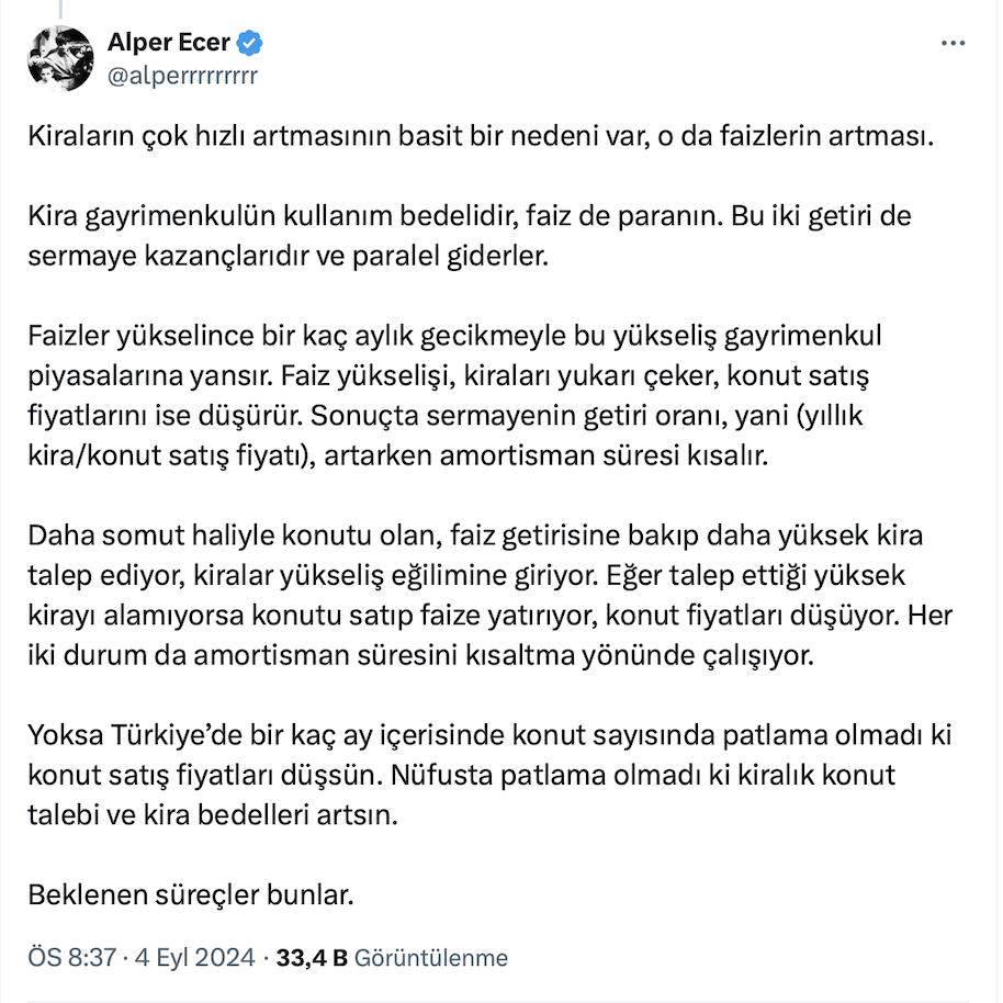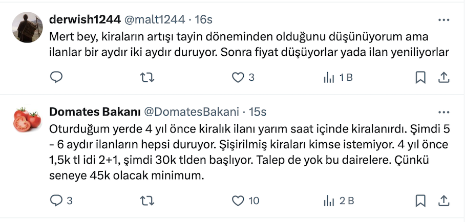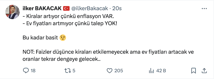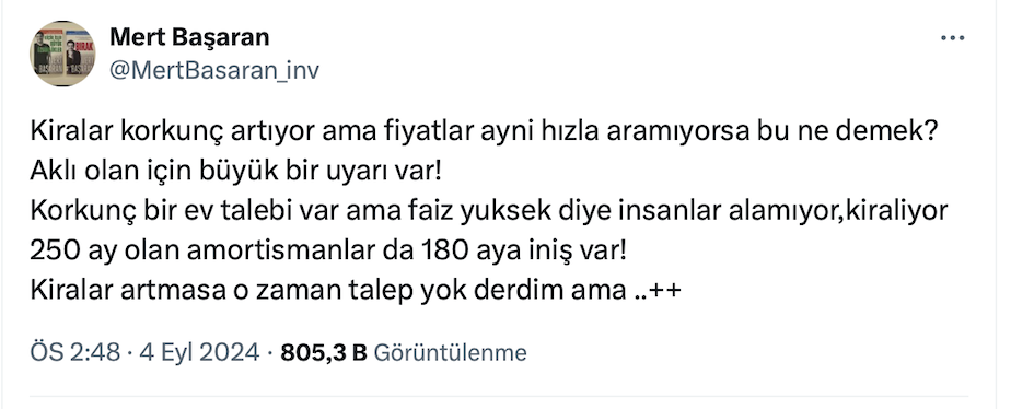 Mert Başaran resmi X hesabı https://x.com/MertBasaran_inv üzerinden yaptığı paylaşımda “Kiralar korkunç artıyor ama fiyatlar aynı hızla artmıyorsa bu ne demek?” diye sordu.