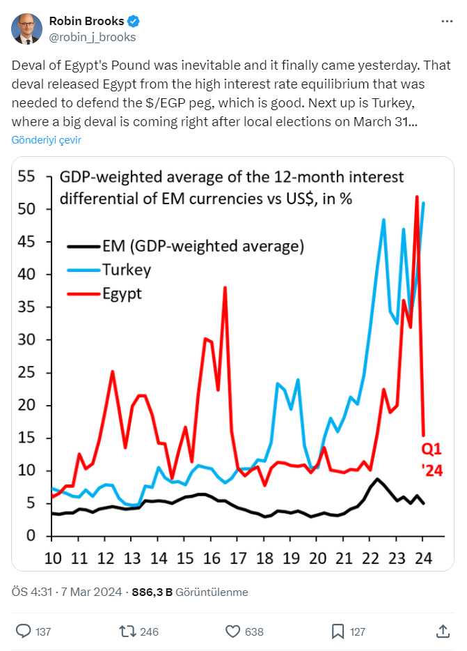 Ünlü ekonomist Robin Brooks paylaşımlarında dikkat çeken bir diğer nokta da Türkiye ekonomisi üzerine yaptığı tahmin. Türkiye'de 31 Mart tarihinde yapılacak olan yerel seçimlerden sonra büyük bir değer kaybının beklendiğini iddia eden ünlü ekonomist Brooks, Mısır'daki devalüasyonun bir öncü olduğunu ima etti. Mısır Merkez Bankası'nın aldığı karar sonrası, bir günde dolar karşısında yüzde 38 değer kaybederek 1 doların 50 Mısır poundu seviyelerine çıkması, piyasalarda da büyük yankı uyandırmıştı.