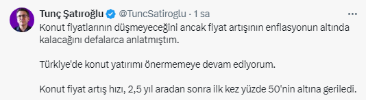 Merkez Bankası’nın açıkladığı rakamları değerlendiren ünlü ekonomist Tunç Şatıroğlu, https://x.com/TuncSatiroglu X sosyal medya hesabı üzerinden yaptığı paylaşımda, “Türkiye’de konut yatırımı önermemeye devam ediyorum” dedi. Konut fiyatlarının artışının enflasyonun altında kalacağını daha önce belirttiğini ifade eden Şatırtoğlu, konutlarda fiyat artış hızının 2,5 yıl aradan sonra ilk kez yüzde 50’nin altında düştüğünü kaydetti. Ünlü ekonomist Türkiye’den eve de arsaya da yatırım yapmayı önermedi.