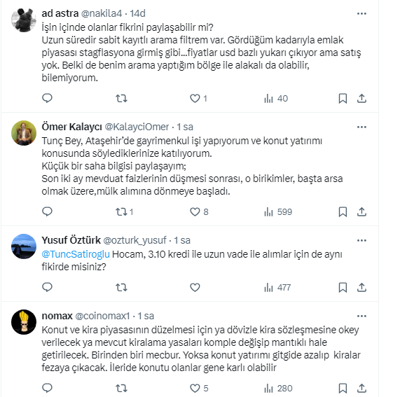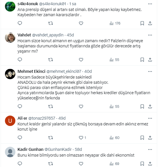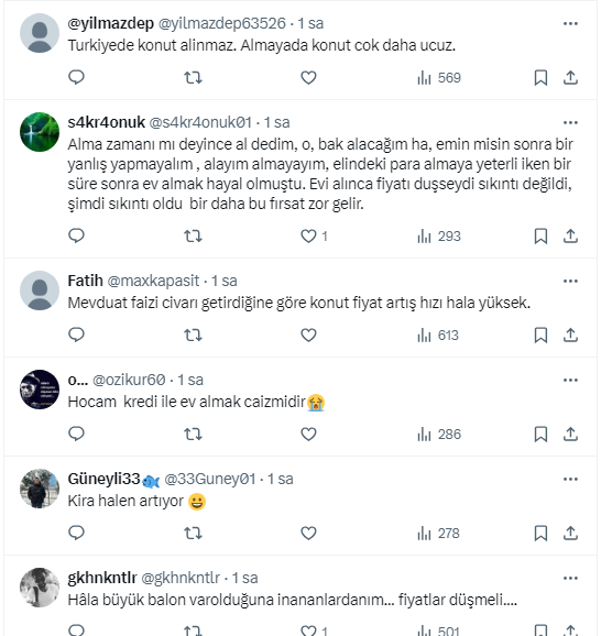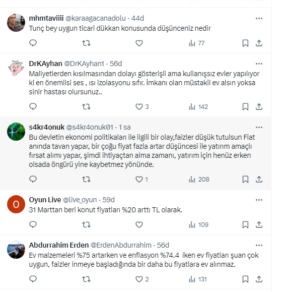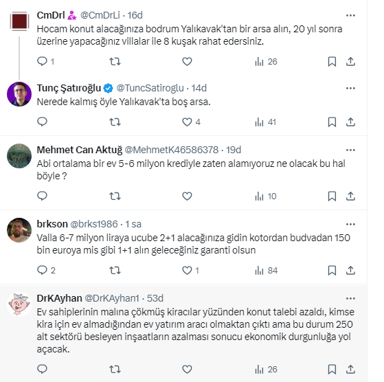 Merkez Bankası tarafından açıkladığı rakamlara göre konut fiyatları bir önceki yılın aynı dönemine oranla yüzde 48,42 arttı. Ünlü ekonomist Tunç Şatıroğlu, rakamların açıklanmasının ardından, Türkiye’den konut ve arsa almayı önermediğini belirtti.