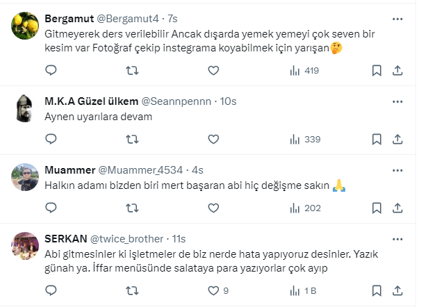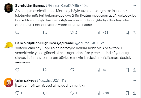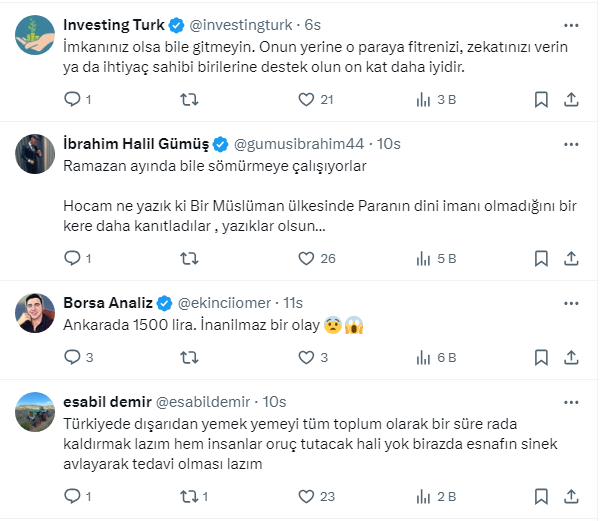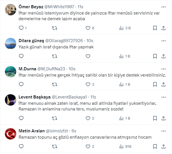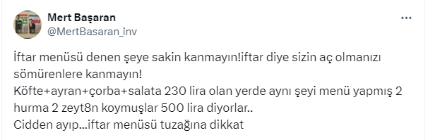 Ünlü ekonomist Mert Başaran https://twitter.com/MertBasaran_inv X Sosyal medya hesabından yaptığı paylaşımda takipçilerini “İftar menüsü denen şeye sakin kanmayın!iftar diye sizin aç olmanızı sömürenlere kanmayın” diyerek uyardı. Başaran, "Köfte+ayran+çorba+salata 230 lira olan yerde aynı şeyi menü yapmış 2 hurma 2 zeyt8n koymuşlar 500 lira diyorlar.. Cidden ayıp... İftar menüsü tuzağına dikkat” dedi. Takipçilerinden Başaran’ın bu gönderisine yorum yağdı.
