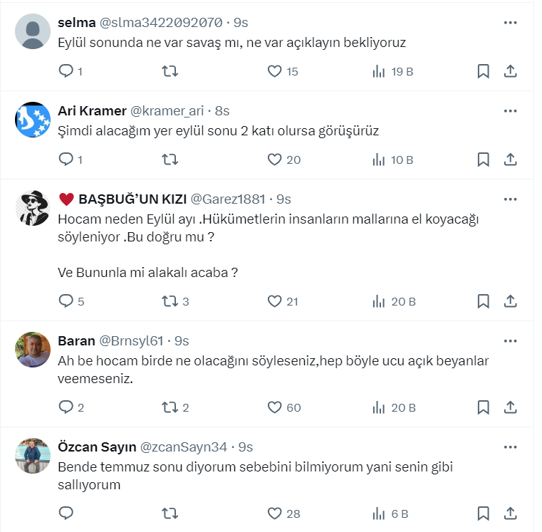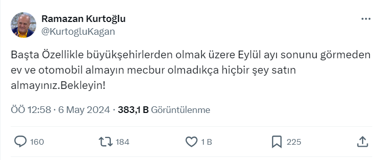 Ekonomist Kurtoğlu paylaşımında "Başta Özellikle büyükşehirlerden olmak üzere Eylül ayı sonunu görmeden ev ve otomobil almayın mecbur olmadıkça hiçbir şey satın almayınız. Bekleyin" ifadelerini kullandı.