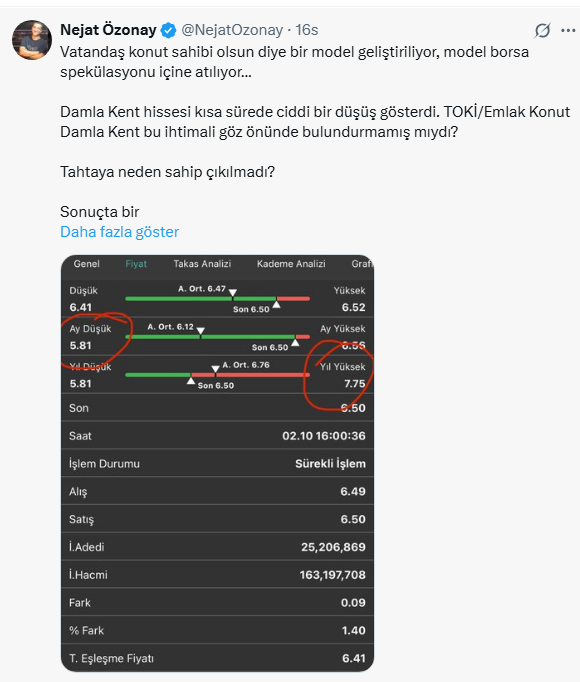 Damla Kent hissesinin kısa sürede ciddi bir düşüş gösterdiğine değinen Özonay 'TOKİ/Emlak Konut Damla Kent bu ihtimali göz önünde bulundurmamış mıydı?'sorusunu yöneltti.