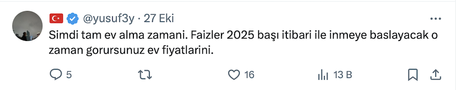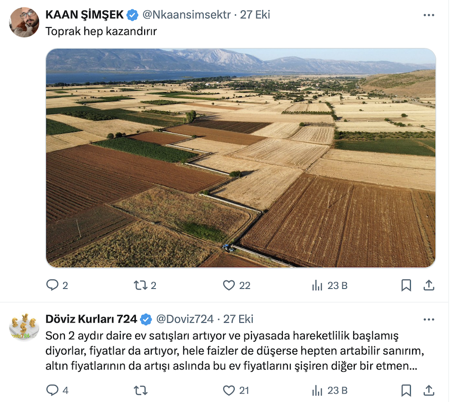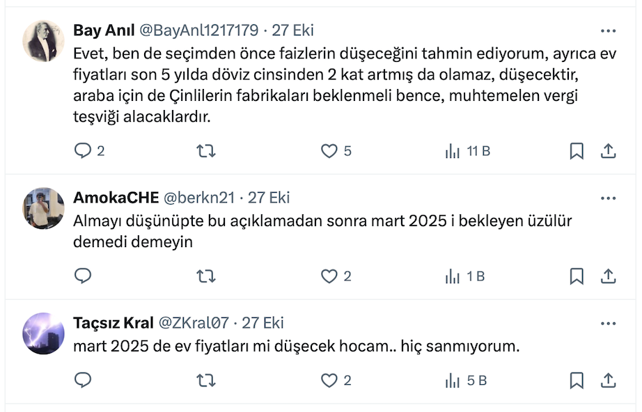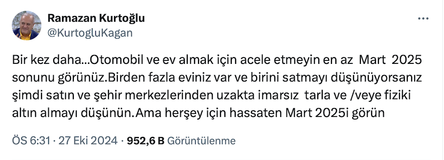 Resmi sosyal X hesabı https://twitter.com/KurtogluKagan üzerinden bir paylaşım yapan Ekonomist Ramazan Kurtoğlu, "Bir kez daha…Otomobil ve ev almak için acele etmeyin en az Mart 2025 sonunu görünüz. Birden fazla eviniz var ve birini satmayı düşünüyorsanız şimdi satın ve şehir merkezlerinden uzakta imarsız tarla ve /veye fiziki altın almayı düşünün.Ama her şey için hassaten Mart 2025i görün" ifadelerini kullandı.