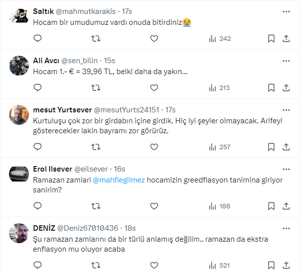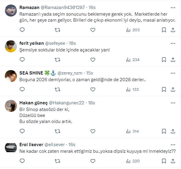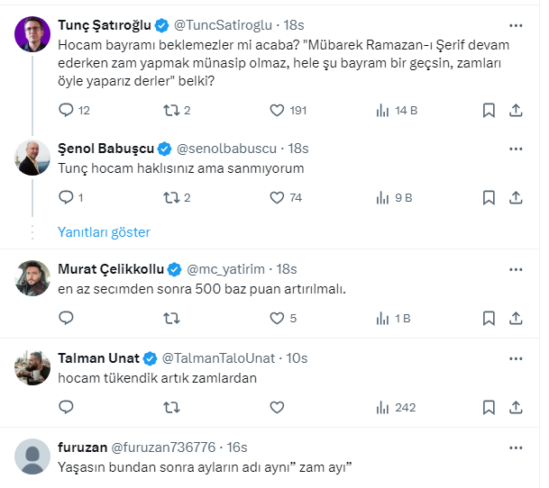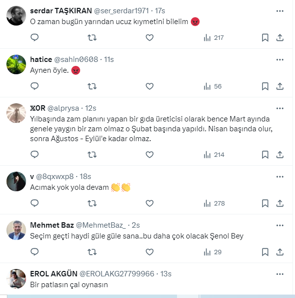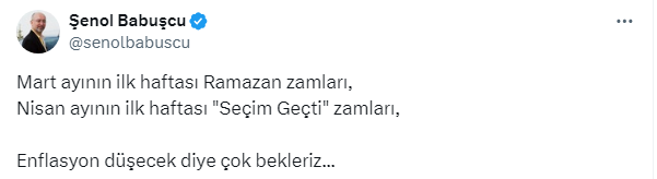 Çarşıya pazara çıkan vatandaş her gün yeni zamlarla karşılaşıyor. Evdeki hesabı bir türlü çarşıda tutturamıyor. Ziraat Bankası Eski Genel Müdür Yardımcısı, Ekonomist Şenol Babuşçu https://twitter.com/senolbabuscu X sosyal medya hesabından yaptı paylaşımda, enflasyonun düşmesini daha çok bekleriz diyerek vatandaşa yeni zamların haberini verdi: “Mart ayının ilk haftası Ramazan zamları, Nisan ayının ilk haftası "Seçim Geçti" zamları...” Babuşçunun takipçileri artık zamlardan bıktıklarını söyledi.