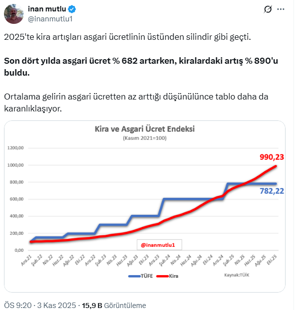 İktisatçı İnan Mutlu sosyal medya hesabından son dört yıldaki asgari ücret ve kiralardaki artışı karşılaştırdı; asgari ücret yüzde 682 artarken, kiralardaki artış yüzde 890'u buldu.