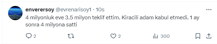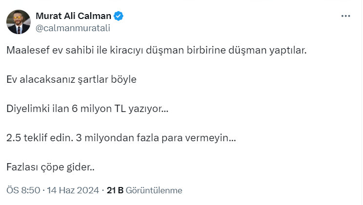 Murat Ali Calman, paylaşımda "Sarı sitede ne kadar içinde kiracı olan konut ilanı varsa %yüzde 50'sini teklif edin Kabul etmezse dönün gidin 3.5 yıl kiracıyı çıkarmakla mı uğraşacaksınız" ifadelerini kullandı.