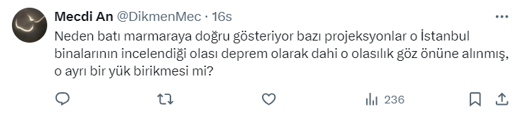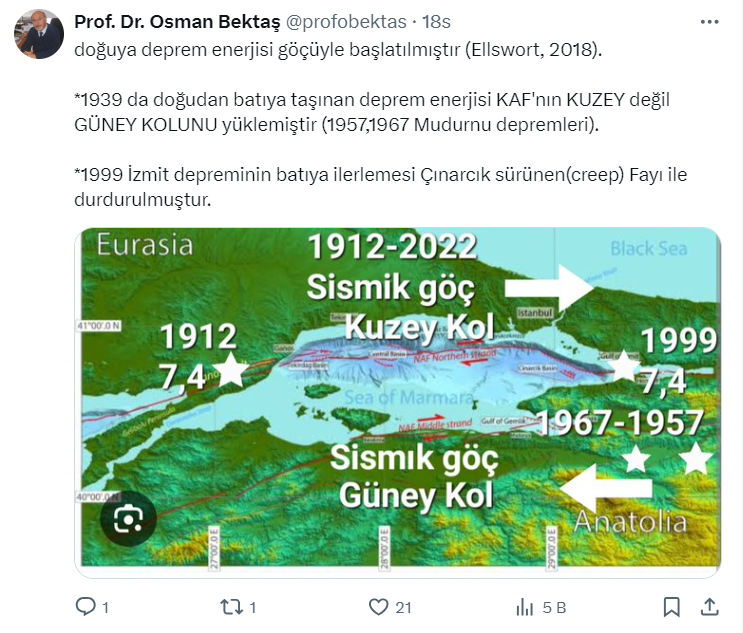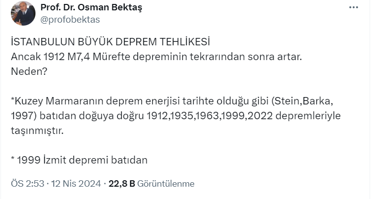 Paylaşımında 1İstanbul'un büyük deprem tehlikesi ancak 1912 M7,4 Mürefte depreminin tekrarından sonra artar." ifadelerini kullanan Osman Bektaş, bunun nedenini de "Kuzey Marmara'nın deprem enerjisi tarihte olduğu gibi (Stein, Barka, 1997) batıdan doğuya doğru 1912, 1935, 1963, 1999, 2022 depremleriyle taşınmıştır." şeklinde açıkladı.