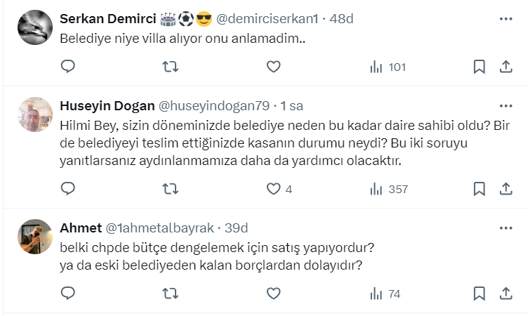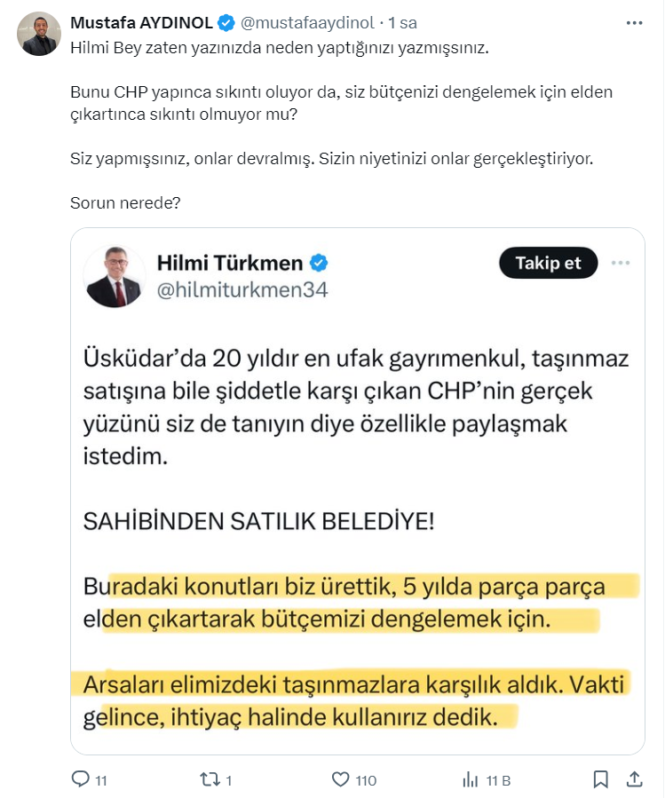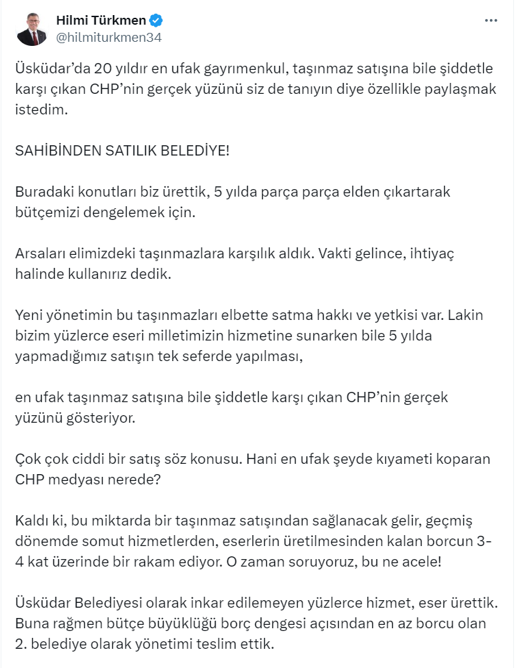 Hilmi Türkmen paylaşımında "Üsküdar'da 20 yıldır en ufak gayrimenkul, taşınmaz satışına bile şiddetle karşı çıkan CHP'nin gerçek yüzünü siz de tanıyın diye özellikle paylaşmak istedim." ifadelerini kullandı.