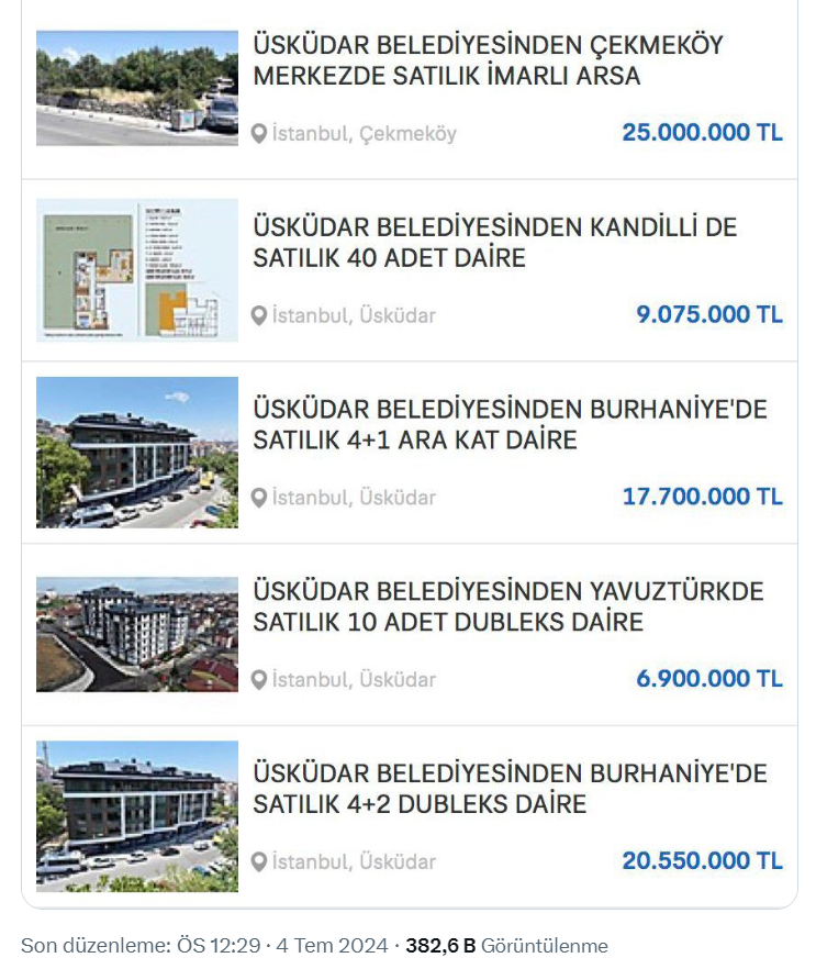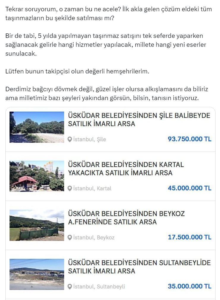 Üsküdar Belediyesi milyonluk konut ve arsaları satışa çıkarırken, belediye eski başkanı Hilmi Türkmen de söz konusu satışları resmi sosyal medya hesabı üzerinden paylaşarak ifşa etti.