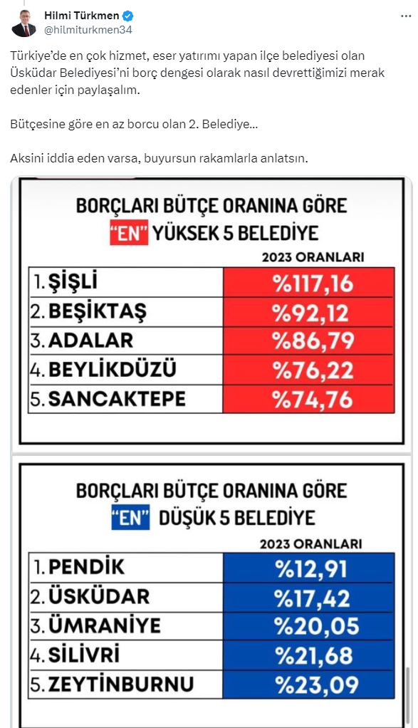 Üsküdar eski belediye başkanı Hilmi Türkmen'in paylaşımı şu şekilde: