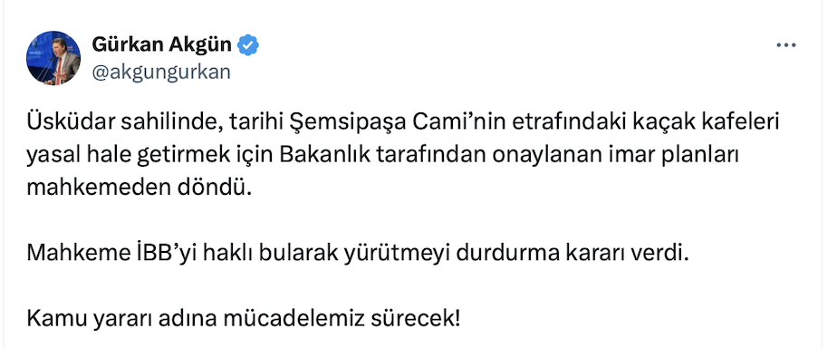 ''Üsküdar sahilinde, tarihi Şemsipaşa Cami’nin etrafındaki kaçak kafeleri yasal hale getirmek için Bakanlık tarafından onaylanan imar planları mahkemeden döndü. Mahkeme İBB’yi haklı bularak yürütmeyi durdurma kararı verdi. Kamu yararı adına mücadelemiz sürecek''