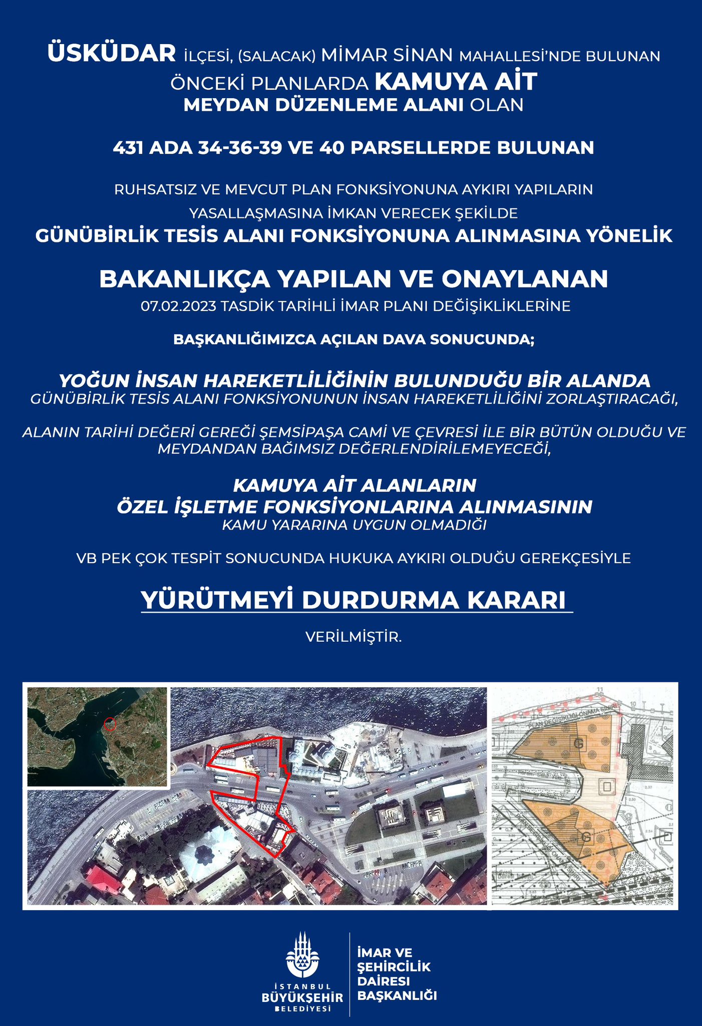 ‘’İstanbul Üsküdar'da yer alan Salacak şeklinde de bilinen Mimar Sinan Mahallesi'nde bulunan ve önceki planlarda kamuya ait meydan düzenleme alanı olan 431 ada 34-36-39 ve 40 parsellerde bulunan ruhsatsız ve mevcut plan fonksiyonuna aykırı yapıların yasallaşmasına imkan verecek biçimde günübirlik tesis alanı fonksiyonuna alınmasına yönelik bakanlık tarafından yapılan ve onaylanan 7 Şubat 2023 tasdik tarihli imar planı değişikliklerine Başkanlığımız tarafından açılan dava sonucunda; yoğun insan hareketliliğinin bulunduğu bir alanda günübirlik tesis alanı fonksiyonunun insan hareketliliğini zorlaştıracağı, alanın tarihi değeri gereği Şemsipaşa Cami ve çevresi ile bir bütün olduğu ve meydandan bağımsız değerlendirilemeyeceği, kamuya ait olan alanların özel işletme fonksiyonlarına alınmasının kamu yararına uygun olmadığı vb. pek çok tespit sonucunda hukuka aykırı olduğu gerekçesi ile yürütmeyi durduma kararı verilmiştir.''