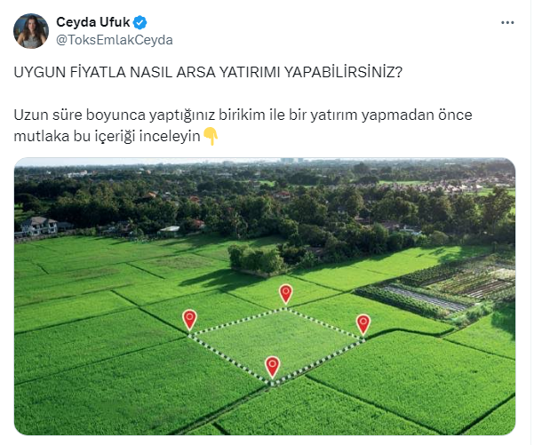 Arsa yatırımı yaparken doğru zamanı, doğru yeri ve doğru stratejiyi uygulamak büyük önem taşıdığını ifade eden Gayrimenkul Değerleme Uzmanı Ceyda Ufuk, uygun fiyatlı arsaları yakalayarak büyük kazançlar elde edebileceğini söyledi. Ceyda Ufuk https://x.com/ToksEmlakCeyda X sosyal medya hesabından yaptığı paylaşımda, uygun fiyatla nasıl arsa yatırımı yapılabileceğini anlattı. Ufuk yaptığı paylaşımda şunları söyledi: