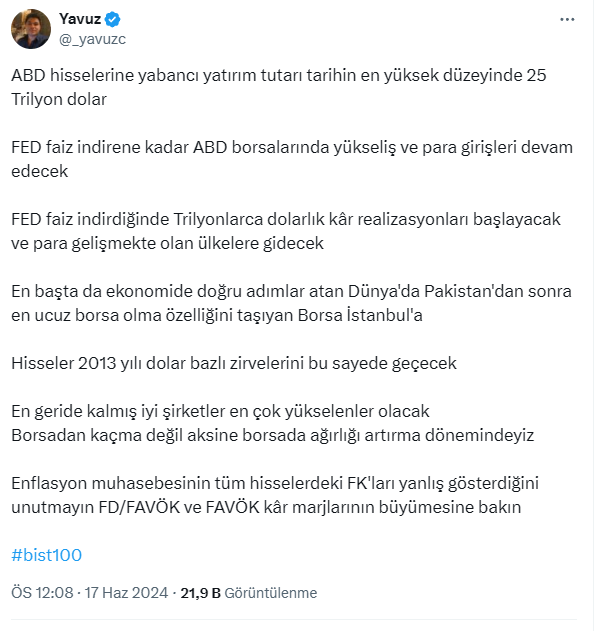 Borsa yatırımına ilgi giderek artarken, Trader Yavuz isimli kullanıcı küresel piyasalardaki gelişmeleri değerlendirerek, 'borsadan kaçmayın aksine borsaya ağırlık verin' uyarısı geldi. Trader Yavuz borsa yatırımcılara sosyal medya hesabı X'ten seslenerek önemli değerlendirmelerde bulundu. İşte o paylaşım ve gelen yorumlar...