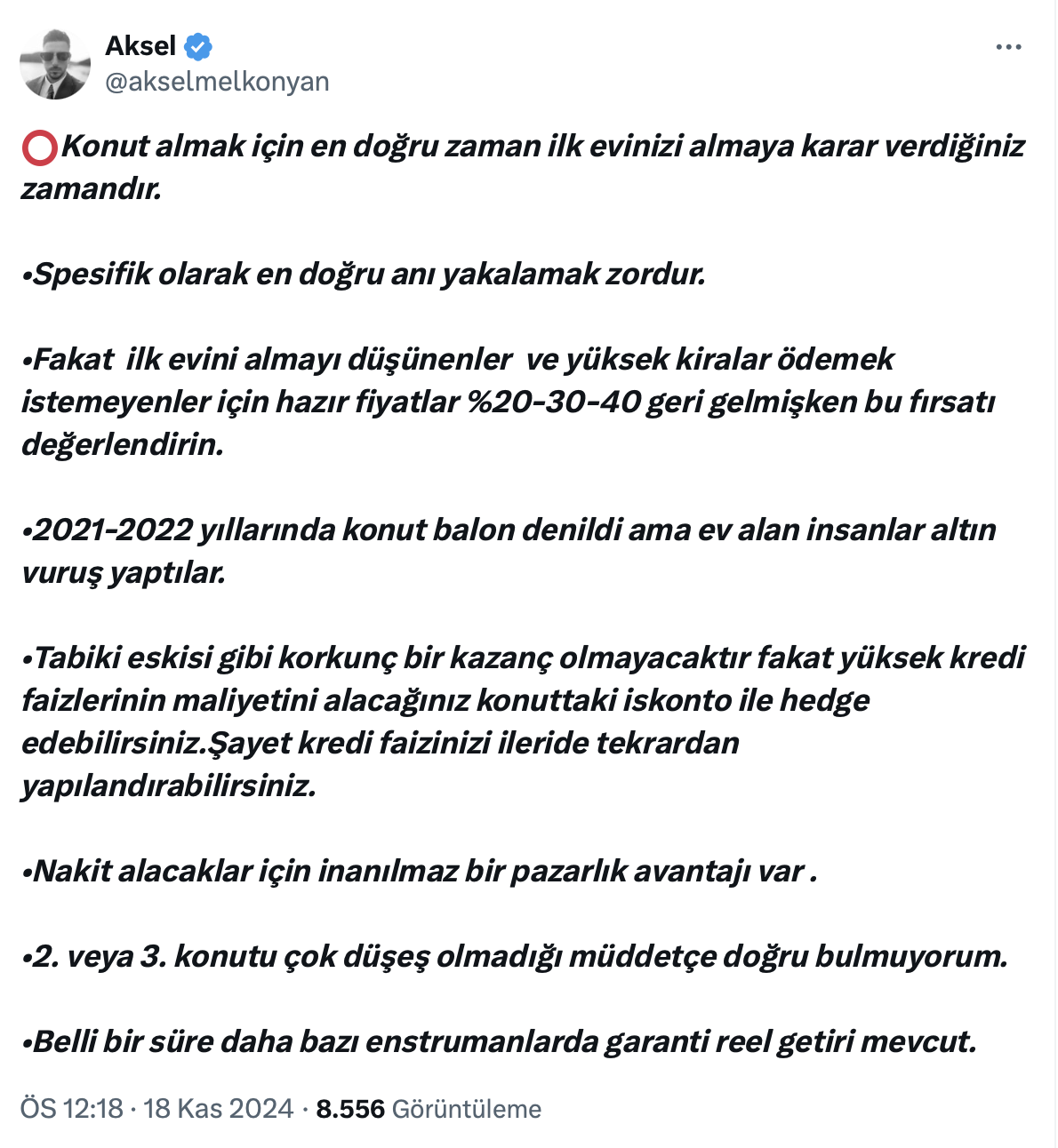 Aksel Melkonyan yaptığı paylaşımda konut almak için en doğru zamanın ilk evinizi almaya karar verdiğiniz zaman olduğunu söyleyerek, “Hazır fiyatlar yüzde 20-30-40 geri gelmişken bu fırsatı değerlendirin.” dedi.