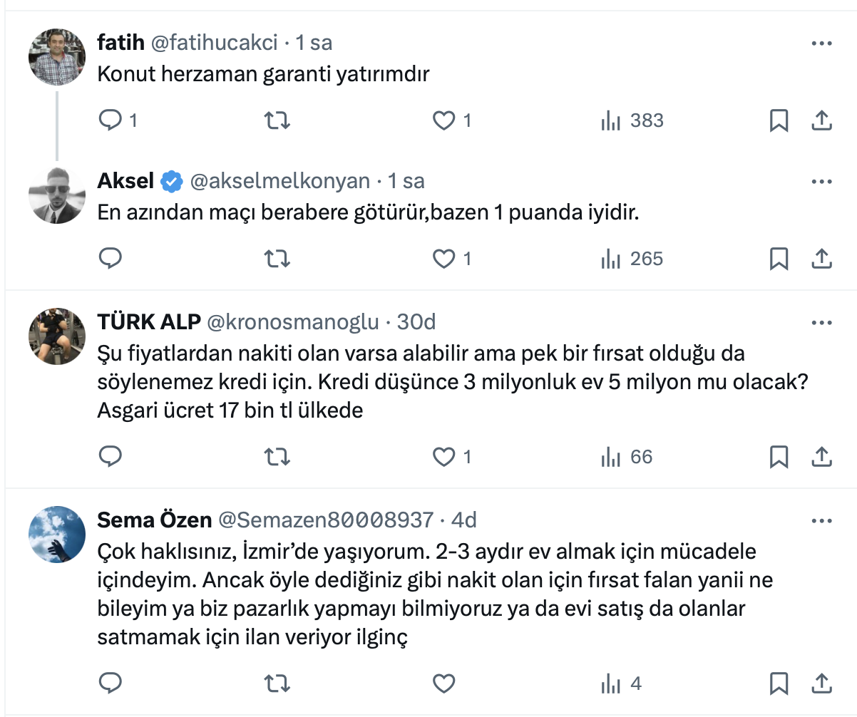 Toprak Yatırımcısı ve Danışmanı Aksel Melkonyan resmi X hesabı üzerinden yaptığı paylaşımda konut almak için en doğru zamanın ilk evinizi almaya karar verdiğiniz zaman olduğunu söyledi.