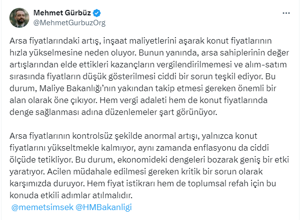 Arsa fiyatlarındaki artışın, inşaat maliyetlerini aşarak konut fiyatlarının hızla yükselmesine neden olduğunu ifade eden Şehir ve Bölge Planlama Uzmanı Mehmet Gürbüz, arsa fiyatları artarken, alım-satım sırasında yapılan usulsüzlükler nedeniyle vergi kaybına neden olduğunu söyledi. Gürbüz fiyatlardaki yükselişin enflasyonu da olumsuz etkilediğini belirterek, Hazine ve Maliye Bakanı Mehmet Şimşek’e çağrıda bulundu.