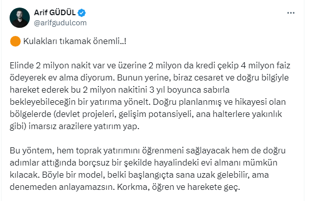 Toprak yatırımcısı ve talepbul’un Yönetim Kurulu Başkanı Arif Güdül kredi çekerek ev almak isteyenlere “alma” tavsiyesinde bulundu. Güdül, https://x.com/arifgudulcom X sosyal medya hesabından yaptığı paylaşımda, şunları söyledi.