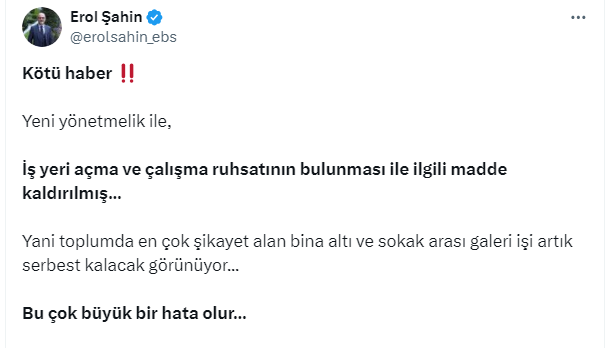 Yeni yönetmeliği değerlendien otomotiv uzmanı Erol Şahin, https://x.com/erolsahin_ebs X sosyal medya hesabından yaptığı paylaşımda, kötü haber diyerek, apartman altı oto galerilerin serbest kaldığını ifade etti.