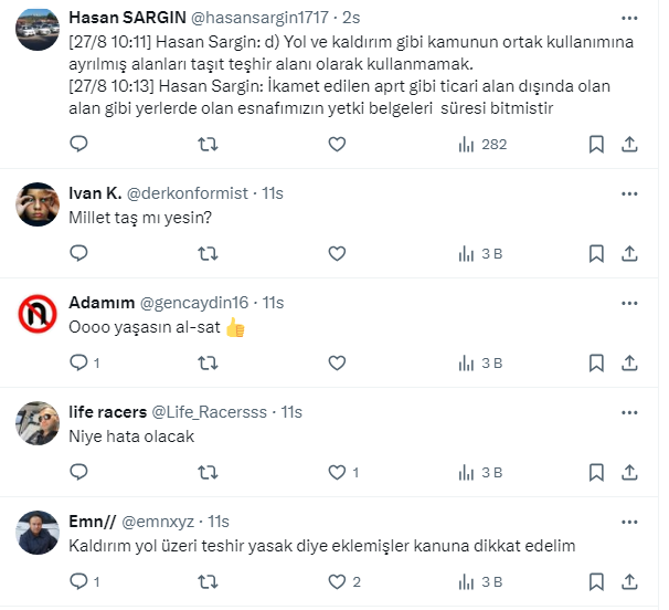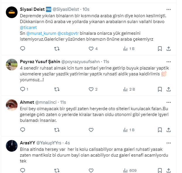 Takipçilerinden bir kısmı bu durumu oto center’lardaki kira fiyatlarını düşüreceği için olumlu karşılarken, vatandaşlar bu tür işletmelerin kolon kesme vs gibi işlemlerle binalara zarar verdiğini Kahramanmaraş depreminde de örneklerinin görüldüğünü söyledi.
