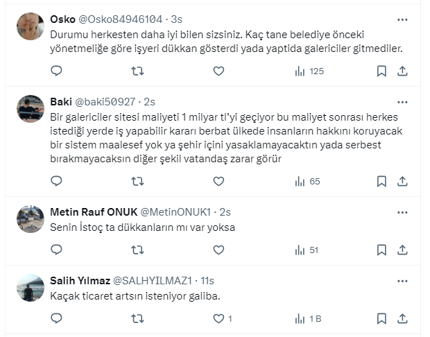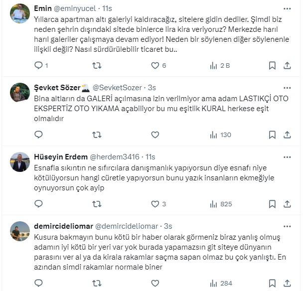 Bir oto galerici ise yaptığı yorumda, “Yıllarca apartman altı galeriyi kaldıracağız, sitelere gidin dediler. Şimdi biz neden şehrin dışındaki sitede binlerce lira kira veriyoruz? Merkezde harıl harıl galeriler çalışmaya devam ediyor! Neden bir söylenen diğer söylenenle ilişkli değil? Nasıl sürdürülebilir ticaret bu” diye sordu.