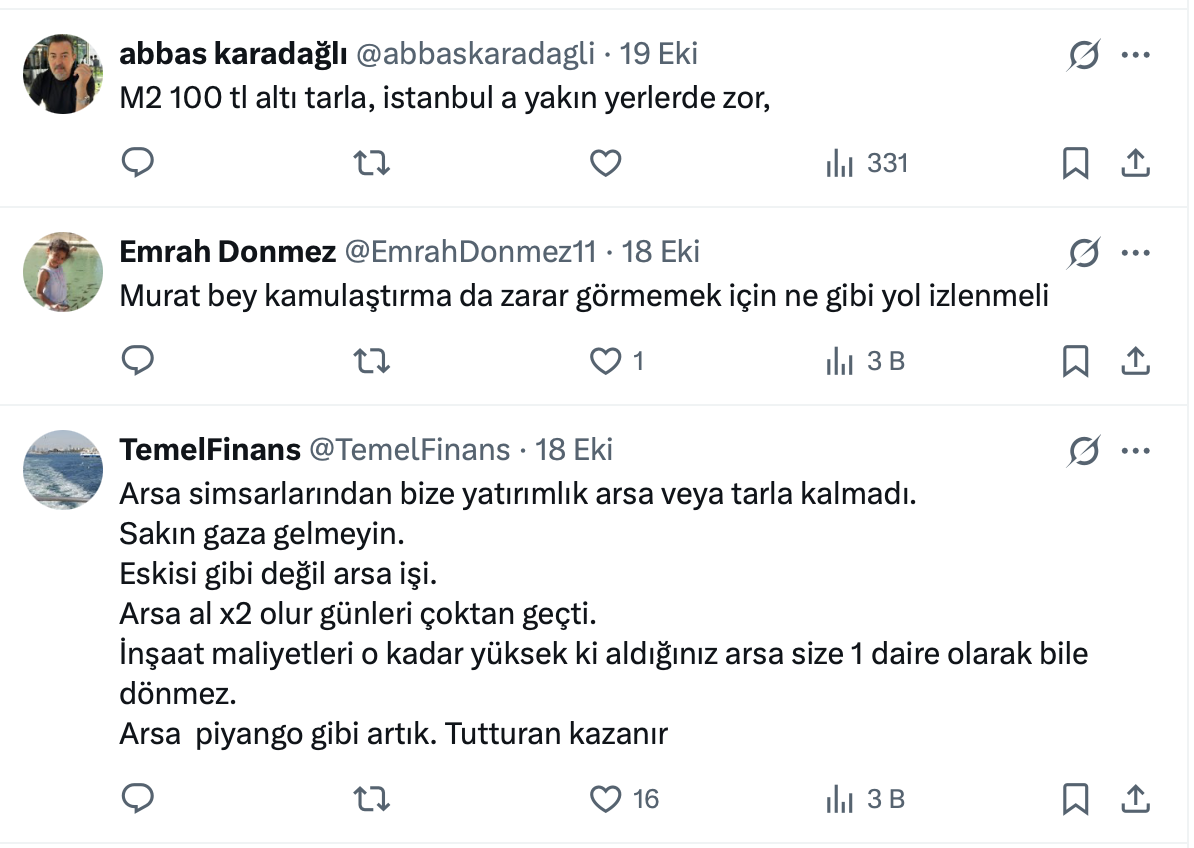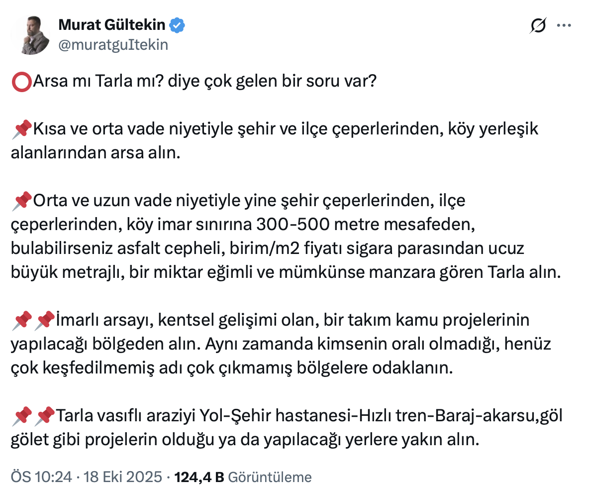 Arsa, arazi ve konut yatırımları ile ilgili detaylar yatırımcıların en çok merak ettiği konular arasında başı çekerken, Gayrimenkul Uzmanı Murat Gültekin’den de yine çok konuşulacak bir paylaşım geldi.