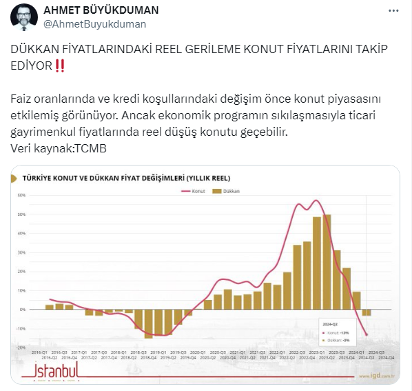 Konut fiyatlarındaki gerileme ile ticari gayrimenkullerdeki düşüşü bir grafik ile gösteren Ahmet Büyükduman https://x.com/AhmetBuyukduman X sosyal medya hesabı üzerinden yaptığı paylaşımda şöyledi: