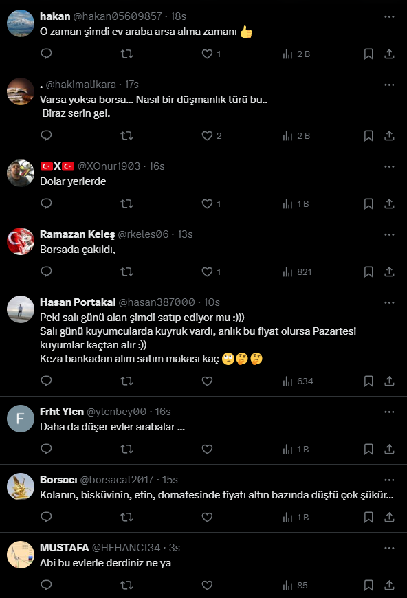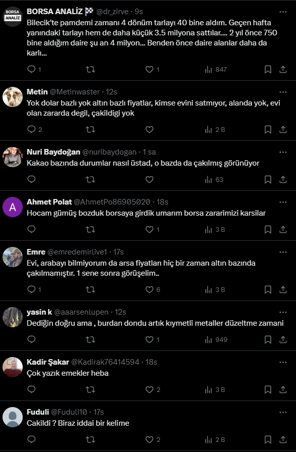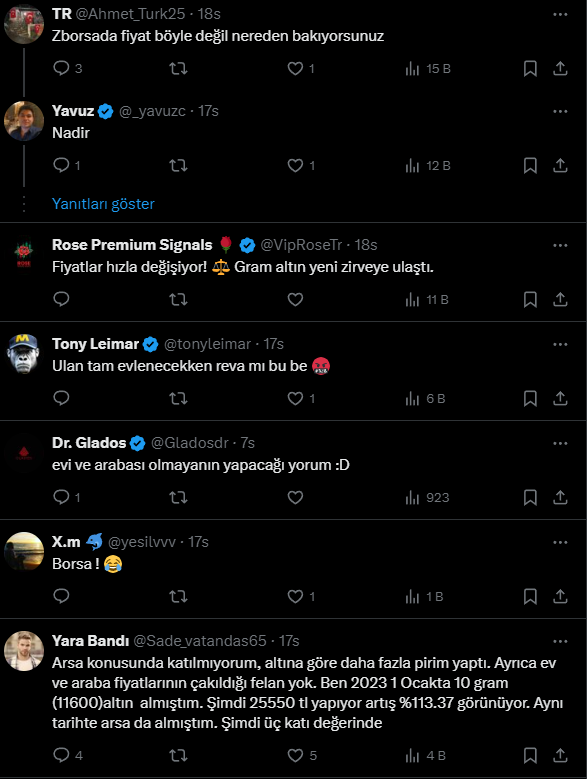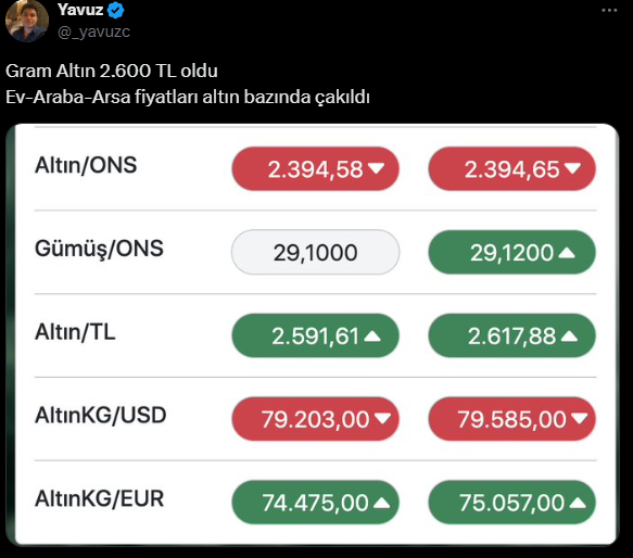 Gram altın 2,500 lirayı geçerken, gözler piyasalara çevrildi. Sosyal medya hesabı X'te altın, konut, yatırım yorumları ile dikkatleri üzerine çeken Makine Mühendisi Yavuz isimli kullanıcı ev, araba ve arsa fiyatlarının altın bazında çakıldığını söyledi. Açıklamasının ardından vatandaşlardan adeta yorum yağmuru geldi. İşte o açıklama ve gelen yorumlar...