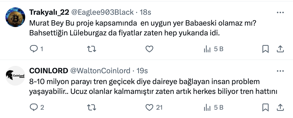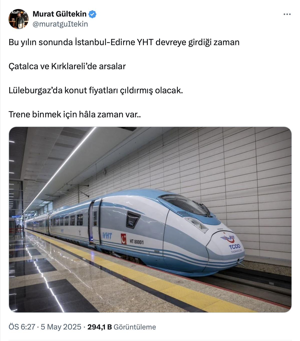 Gayrimenkul Uzmanı Murat Gültekin, yaptığı paylaşımda “Bu yılın sonunda İstanbul-Edirne YHT devreye girdiği zaman Çatalca ve Kırklareli’de arsa Lüleburgaz’da konut fiyatları çıldırmış olacak” dedi.