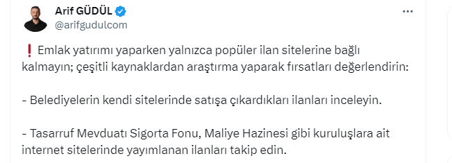 Arif Güdül, X sosyal medya hesabı https://x.com/arifgudulcom X sosyal medya hesabından yaptığı paylaşımda emlak yatırımı yaparken araştırılması gereken noktaları açıkladı.