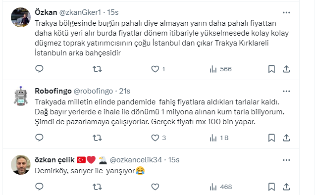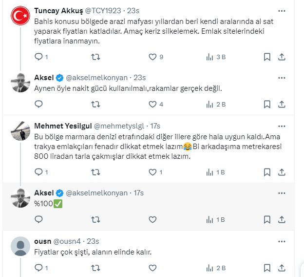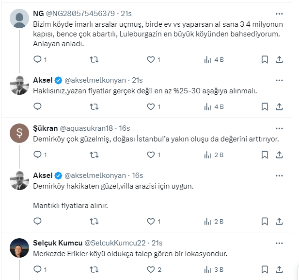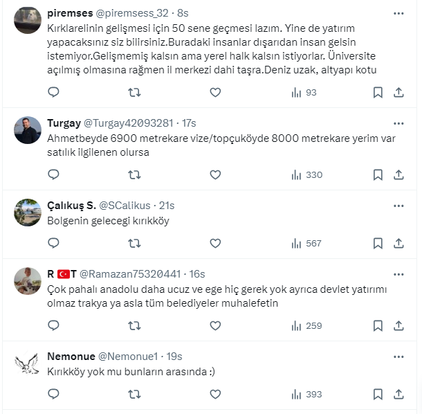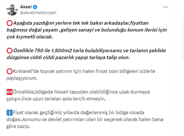 Arsa, toprak, arazi değerini her geçen gün artırırken, Toprak Yatırımcısı ve Danışmanı Aksel Melkonyan, https://x.com/akselmelkonyan X sosyal medya hesabından Kırklareli’ndeki fırsat bölgelerini açıkladı. Arazi almak için uygun olan ilçelerin ve köylerin isimlerini sıraladı.