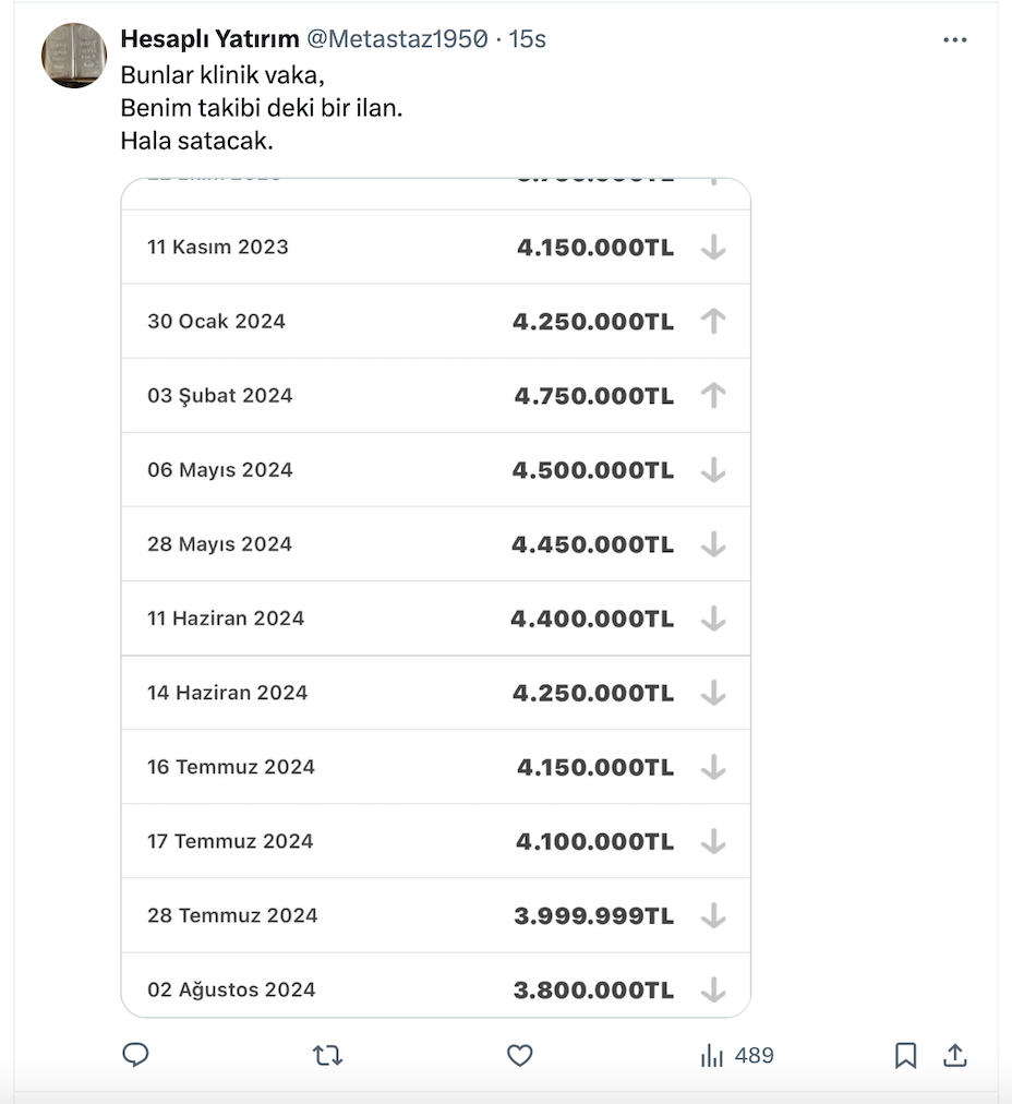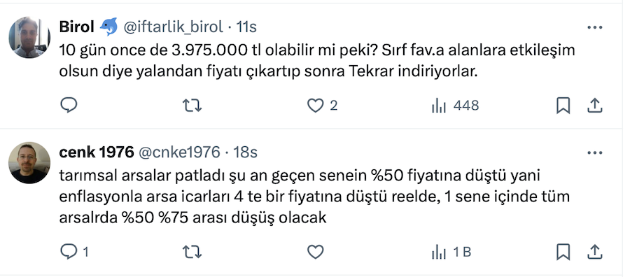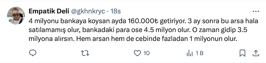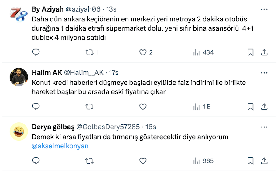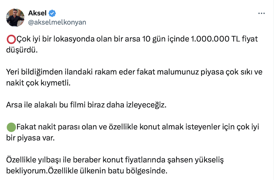Aksel Melkonyan paylaşımında çok iyi bir lokasyonda olan bir arsanın 10 gün içinde 1 milyon TL fiyat düşürdüğünü belirterek, nakit parası olan ve özellikle konut almak isteyenler için çok iyi bir piyasa olduğunu söyledi.