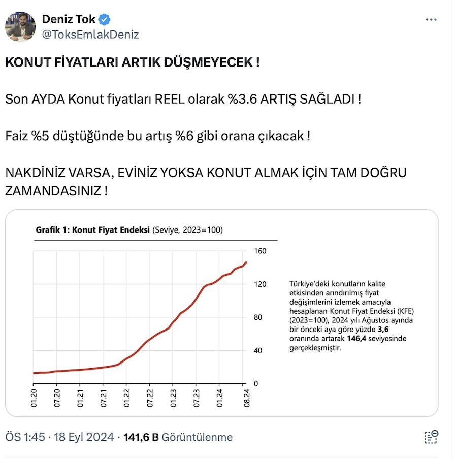 Konut fiyatlarının seyri pek çok kişi tarafından merak edilirken, Tok’s Emlak ve D.T İnşaat Kurucusu Deniz Tok da resmi sosyal medya hesabı https://x.com/ToksEmlakDeniz üzerinden yaptığı paylaşımda konut fiyatlarının düşmeyeceğini söyledi.