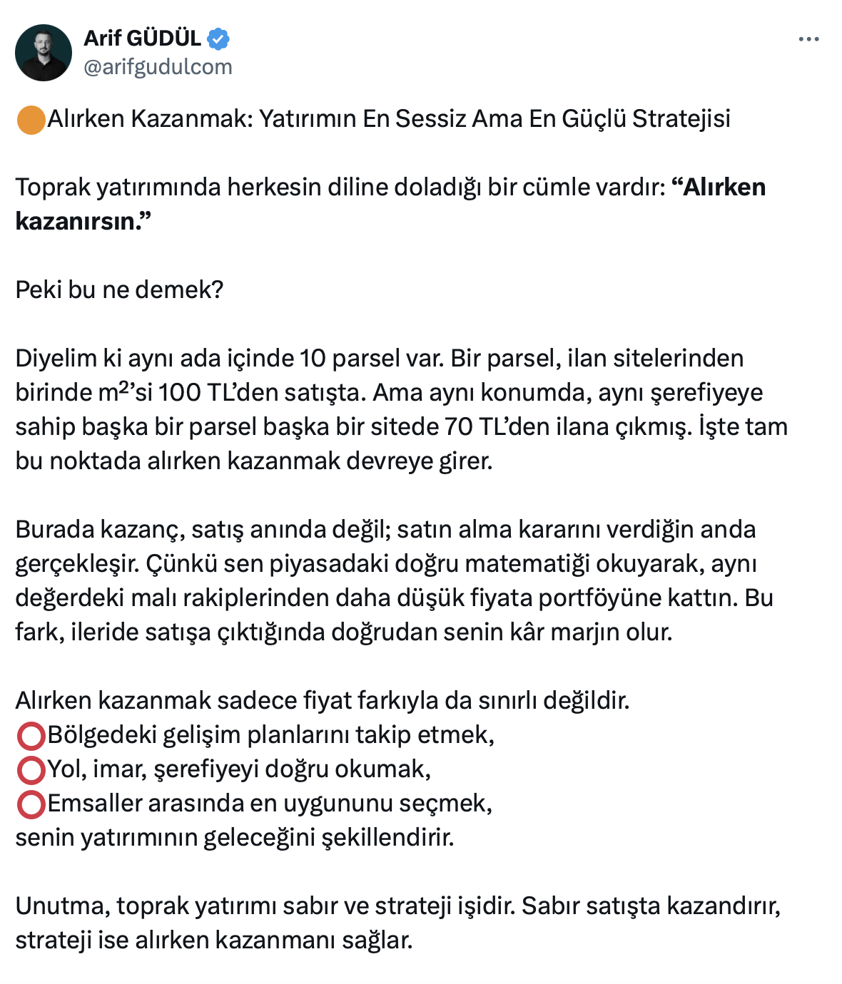 Arif Güdül resmi sosyal medya hesabı üzerinden yaptığı paylaşımda toprak yatırımında alırken kazanmanını ne demek olduğunu açıkladı.