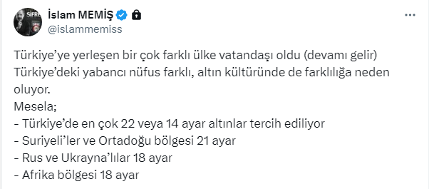 Altın ve Para Piyasaları Uzmanı İslam Memiş, https://x.com/islammemiss X sosyal medya hesabından yaptığı paylaşımda, Türkiye’ye farklı ülkelerden gelen yabancılar nedeniyle altın kültürünün değiştiğini belirterek, hangi ülke vatandaşlarının hangi altın ayarını tercih ettiğini söyledi: