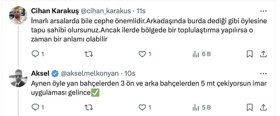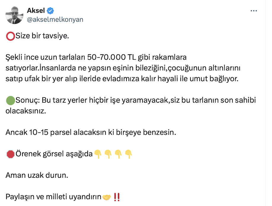 Toprak Yatırımcısı ve Danışmanı Aksel Melkonyan, https://x.com/akselmelkonyan resmi X sosyal medya hesabından yaptığı paylaşımda arazi yatırımı yapmak isteyenler için çok önemli uyarılar yaparak, dikkat edilmesi gereken noktaları açıkladı.