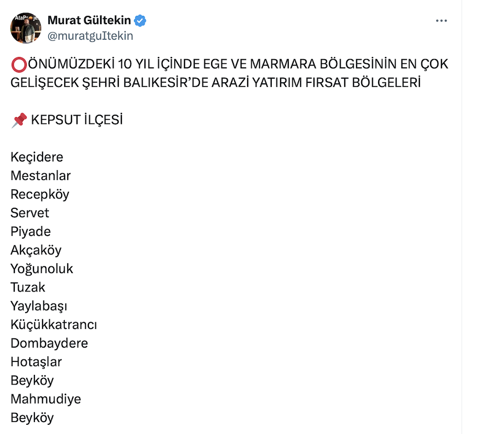 Yeni bir arsa ya da arazi almak isteyenler toprak yatırımları ile ilgili detayları araştırırken, İş insanı, Gayrimenkul Uzmanı Murat Gültekin, resmi sosyal medya hesabı https://x.com/muratguItekin üzerinden yaptığı paylaşımda Ege ve Marmara bölgesinin en çok gelişecek şehri Balıkesir’de arazi yatırımı için fırsat bölgeleri açıkladı.