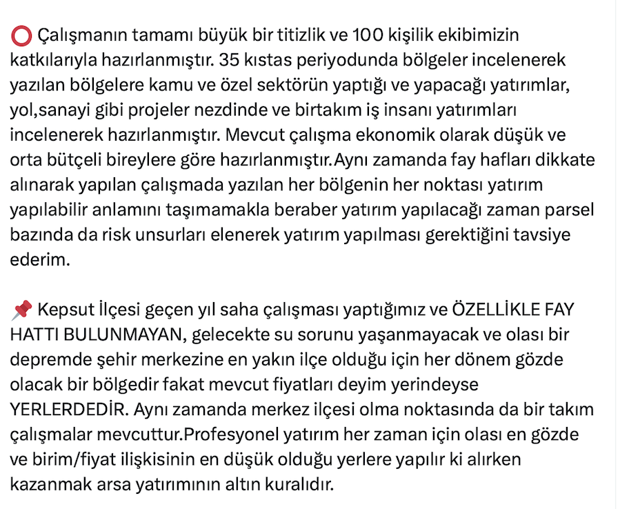 Çalışmanın tamamı büyük bir titizlik ve 100 kişilik ekibimizin katkılarıyla hazırlanmıştır. 35 kıstas periyodunda bölgeler incelenerek yazılan bölgelere kamu ve özel sektörün yaptığı ve yapacağı yatırımlar, yol,sanayi gibi projeler nezdinde ve birtakım iş insanı yatırımları incelenerek hazırlanmıştır. Mevcut çalışma ekonomik olarak düşük ve orta bütçeli bireylere göre hazırlanmıştır.Aynı zamanda fay hafları dikkate alınarak yapılan çalışmada yazılan her bölgenin her noktası yatırım yapılabilir anlamını taşımamakla beraber yatırım yapılacağı zaman parsel bazında da risk unsurları elenerek yatırım yapılması gerektiğini tavsiye ederim.